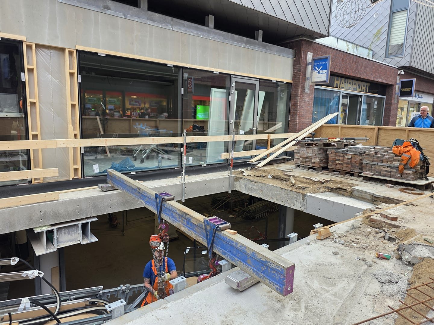 Ondertussen wordt er ook gewerkt aan een nieuwe Lidl supermarkt. Deze werkzaamheden zullen langer duren, maar ook hier is de afgelopen weken al veel veranderd. Vrijwel alle muren tussen de winkels die hier vroeger zaten zijn weggehaald en ook de (goederen)gang aan de achterzijde is grotendeels gesloopt. Hierdoor kun je nu ‘door’ te winkel heen kijken. De supermarkt krijgt een volledig nieuwe gevel, die ook nog een stukje naar voren is gekomen ten opzichte van de vroegere winkels die hier zaten.