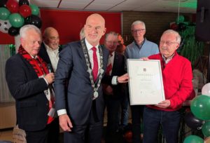 BARENDRECHT – Ter ere van het 100-jarig bestaan heeft voetbalvereniging BVV Barendrecht een gemeentelijke Waarderingsoorkonde ontvangen. De oorkonde werd namens de gemeente uitgereikt door burgemeester Ronald Schneider aan de aanwezige oud-voorzitters van de vereniging en de huidige voorzitter Frank van Beuningen (links op de foto) tijdens de viering van het 100-jarig bestaan op de club.