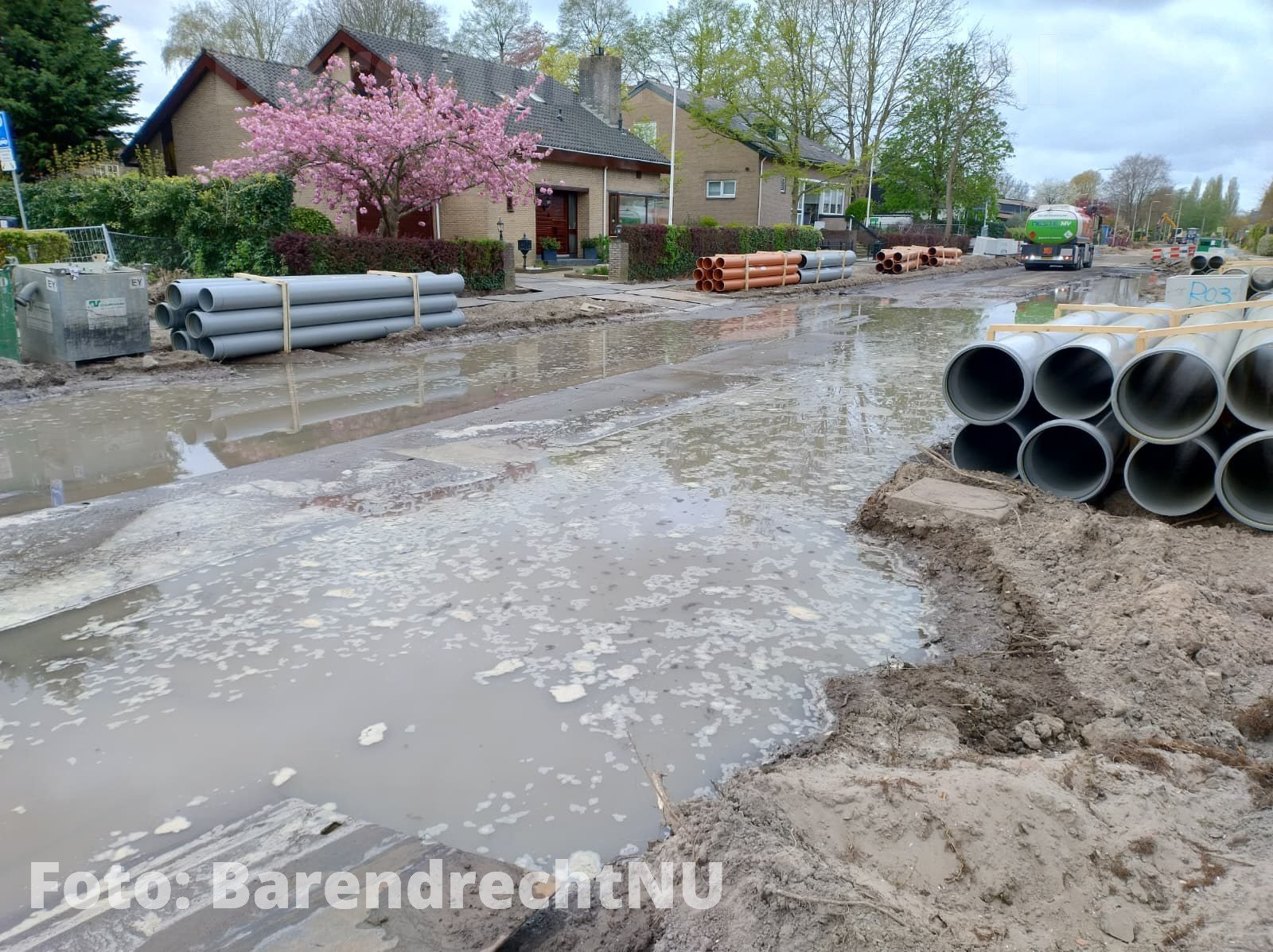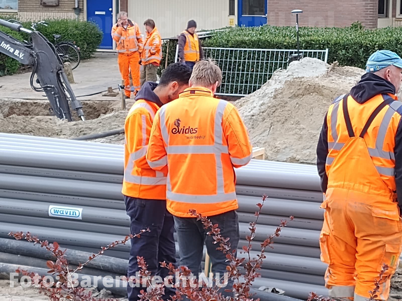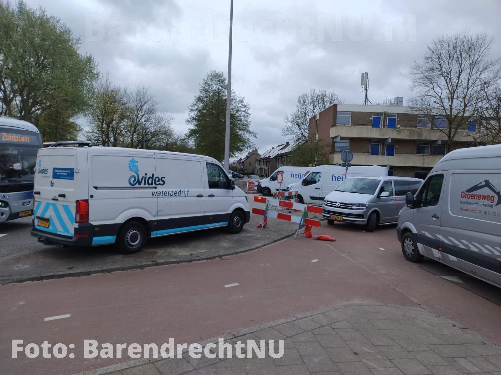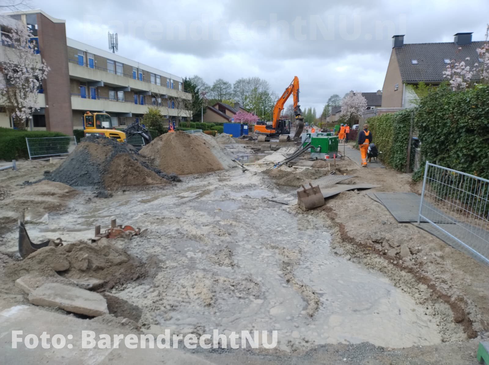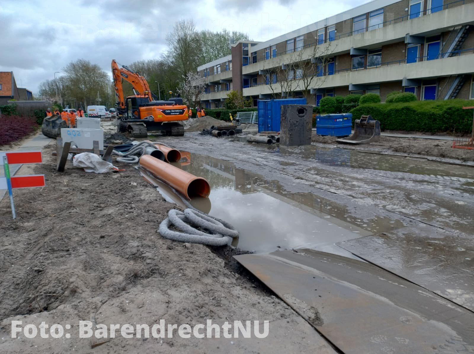 BARENDRECHT – [Foto’s] Bij de werkzaamheden aan het Jaagpad is vanochtend (Vrijdag 10 april 2026) een waterlekkage ontstaan. Het werkvlak ter hoogte van de rotonde bij de 1e Barendrechtseweg staat grotendeels onder water. Bewoners maakte in eerste instantie melding van bruin water uit de kraan, maar inmiddels hebben werklieden de watertoevoer volledig afgesloten om verdere overstroming te voorkomen. Omwonenden hebben momenteel geen water.