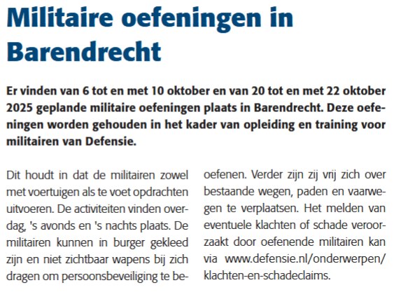 Er vinden van 6 tot en met 10 oktober en van 20 tot en met 22 oktober 2025 geplande militaire oefeningen plaats in #Barendrecht. Deze oefeningen worden gehouden in het kader van opleiding en training voor militairen van Defensie. https://t.co/JB7M8XHMKL
